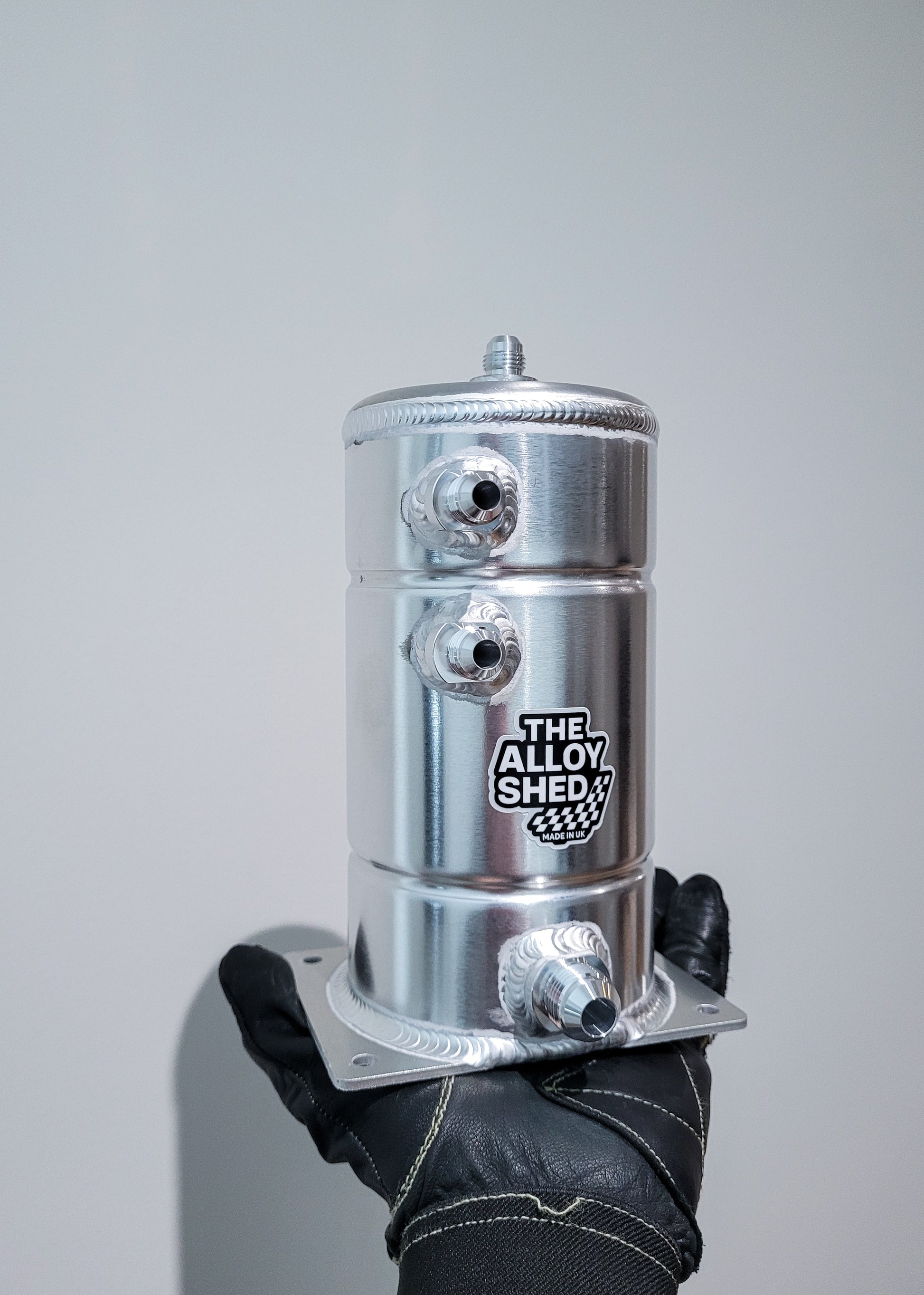 Manufactured in aluminium and fully TIG welded, it features motorsport-style AN fittings and a compact vertical layout suitable for custom and performance fuel systems.